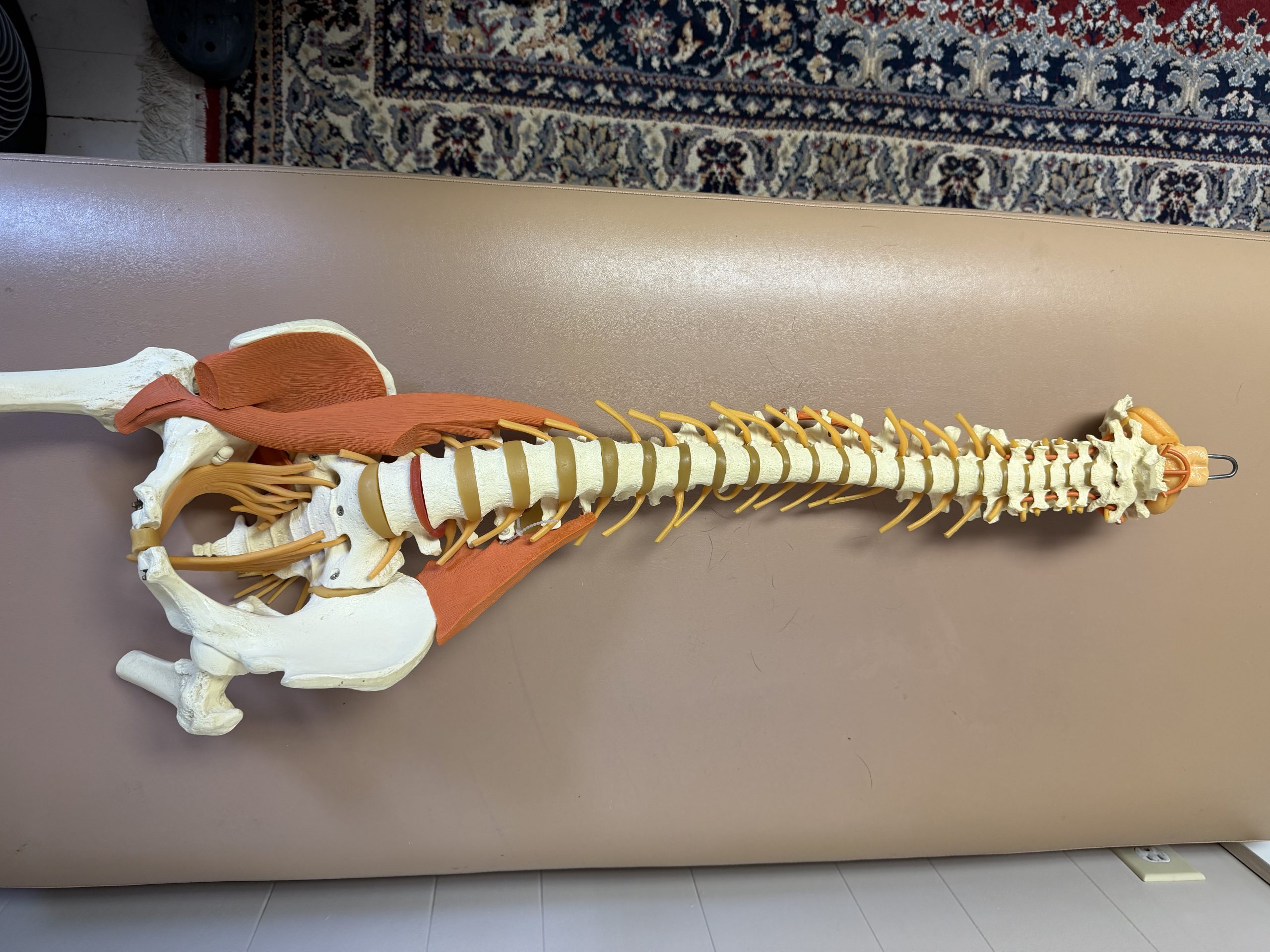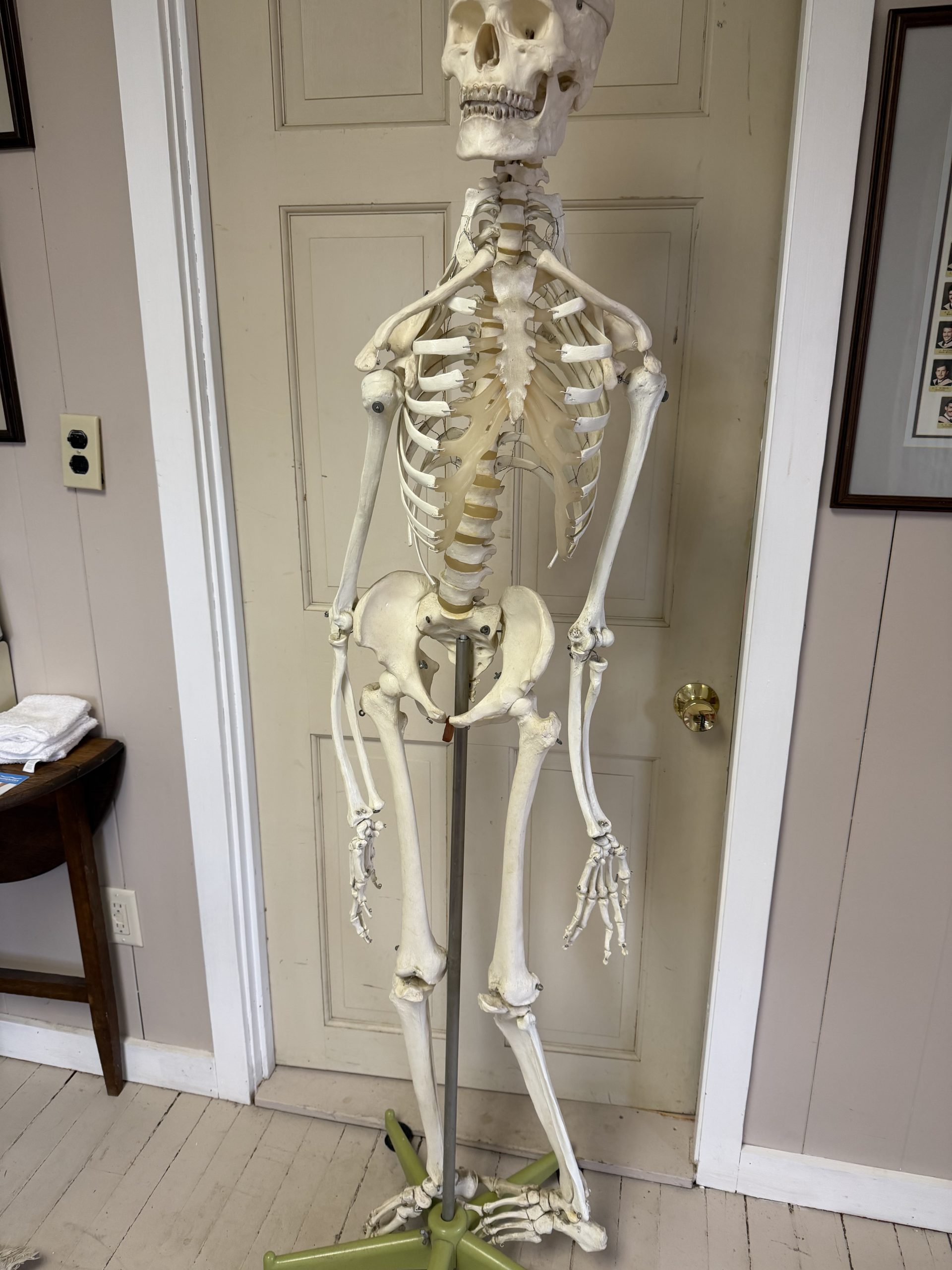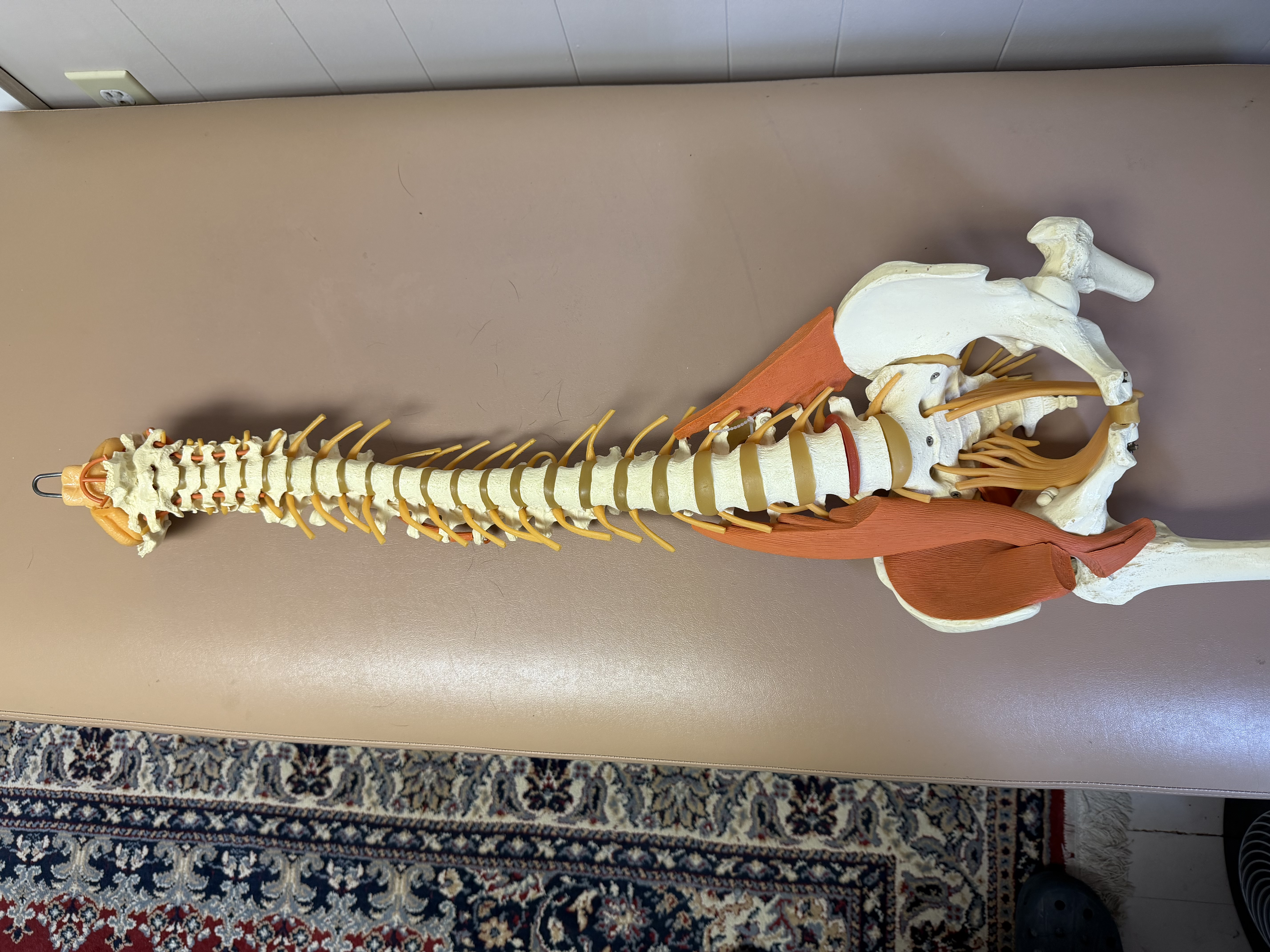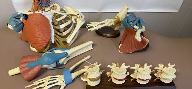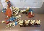 Outstanding collection of joint models, including wood stands: Shoulder/Chest/Neck with nerves and muscles; Spine/Pelvis with nerves; Vertebrae/Discs with 4-Stage Spinal Degeneration; Shoulder/Scapula with muscles; Hand/Wrist; Knee/Leg with muscles; Foot/Ankle; Full Skeleton and stand.