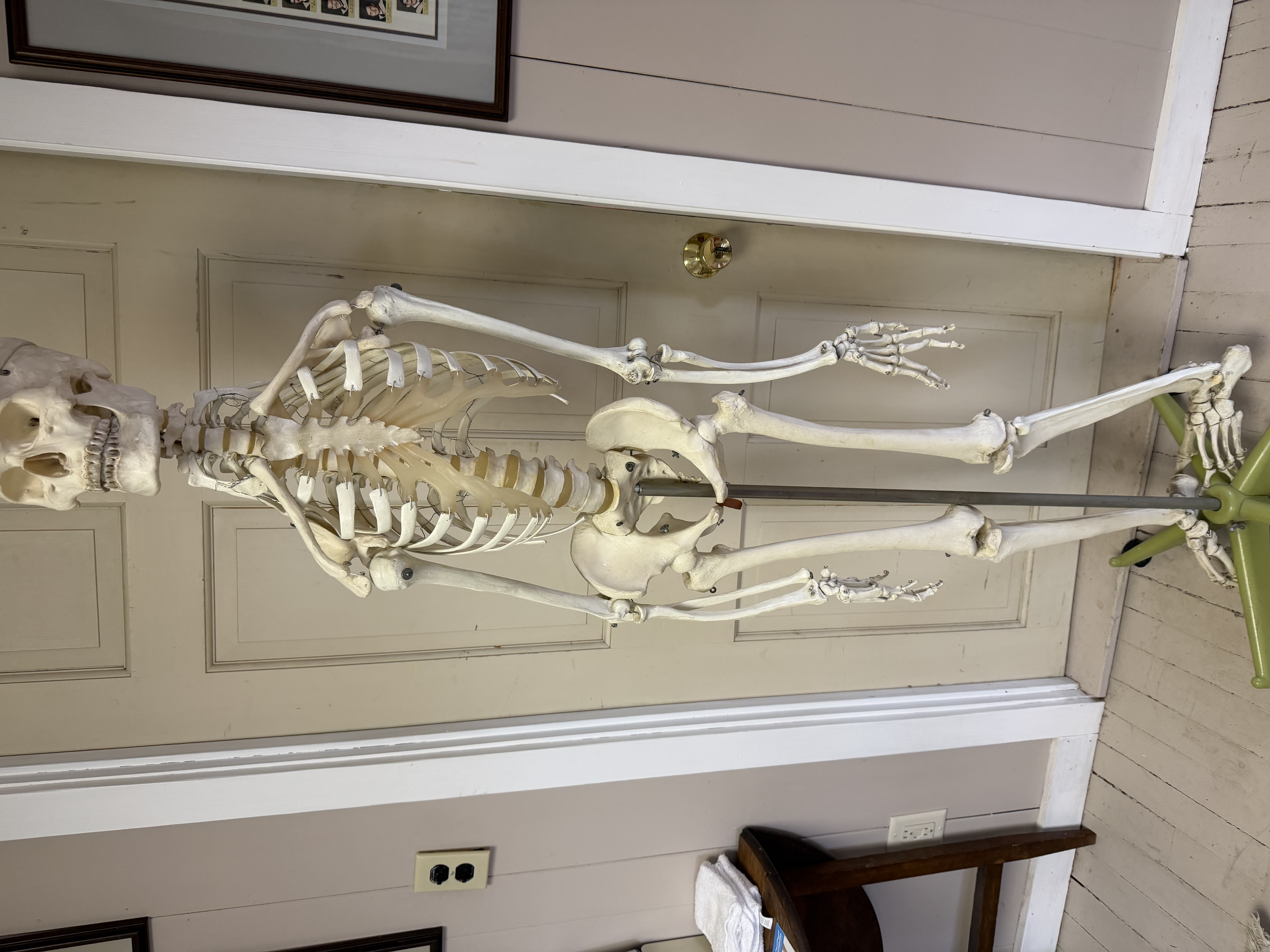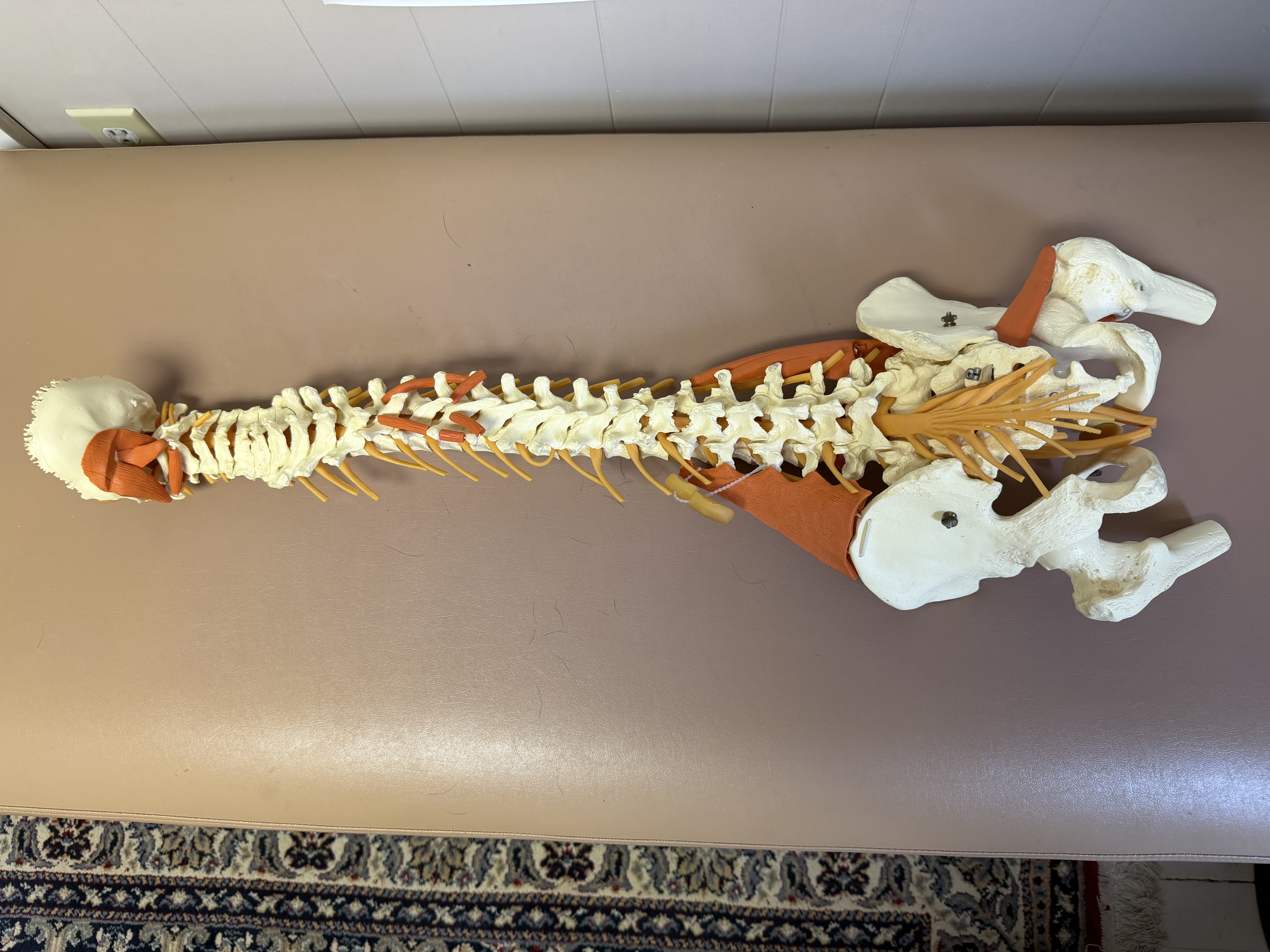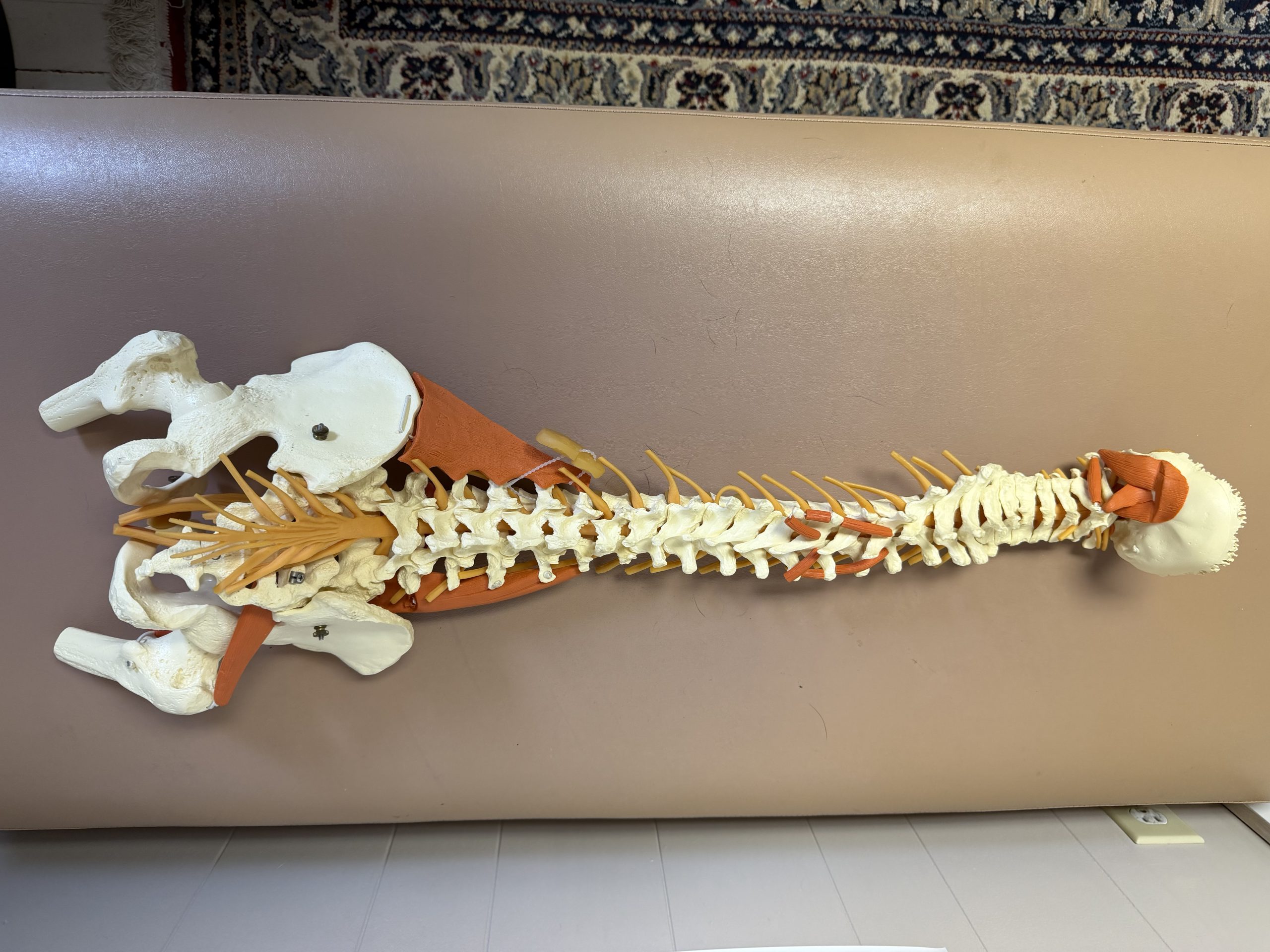 Outstanding collection of joint models, including wood stands: Shoulder/Chest/Neck with nerves and muscles; Spine/Pelvis with nerves; Vertebrae/Discs with 4-Stage Spinal Degeneration; Shoulder/Scapula with muscles; Hand/Wrist; Knee/Leg with muscles; Foot/Ankle; Full Skeleton and stand.