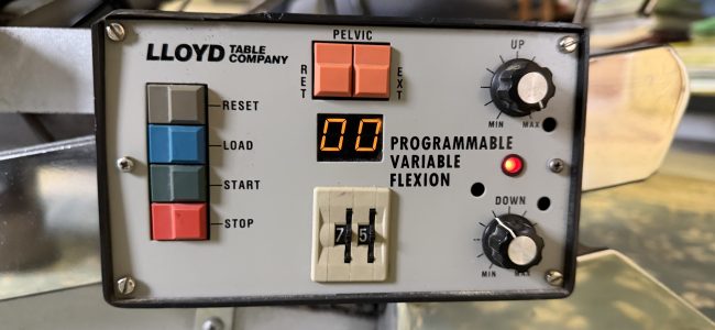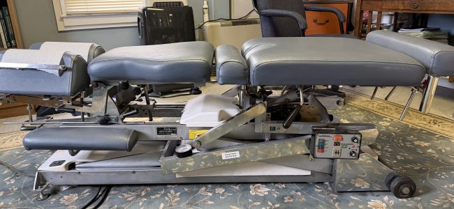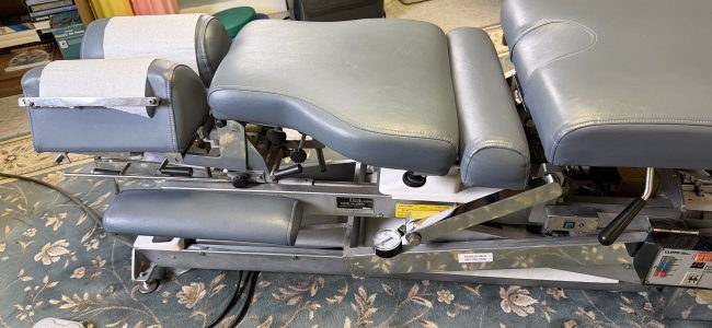 Really good price for an excellent table – Lloyd McManus flexion-distraction vertilift table, with pelvic drop, thoracic and cervical tilt. In excellent condition with cushions that look and feel new. Manual or automatic flexion-distraction. If needed, may be willing to help with a first-floor delivery. A serious, reasonable offer may be considered.
